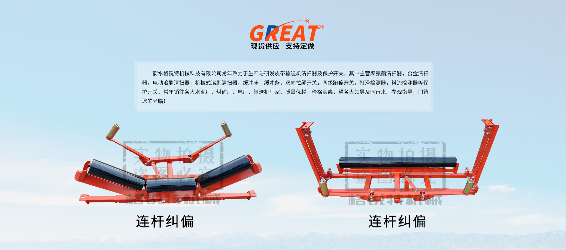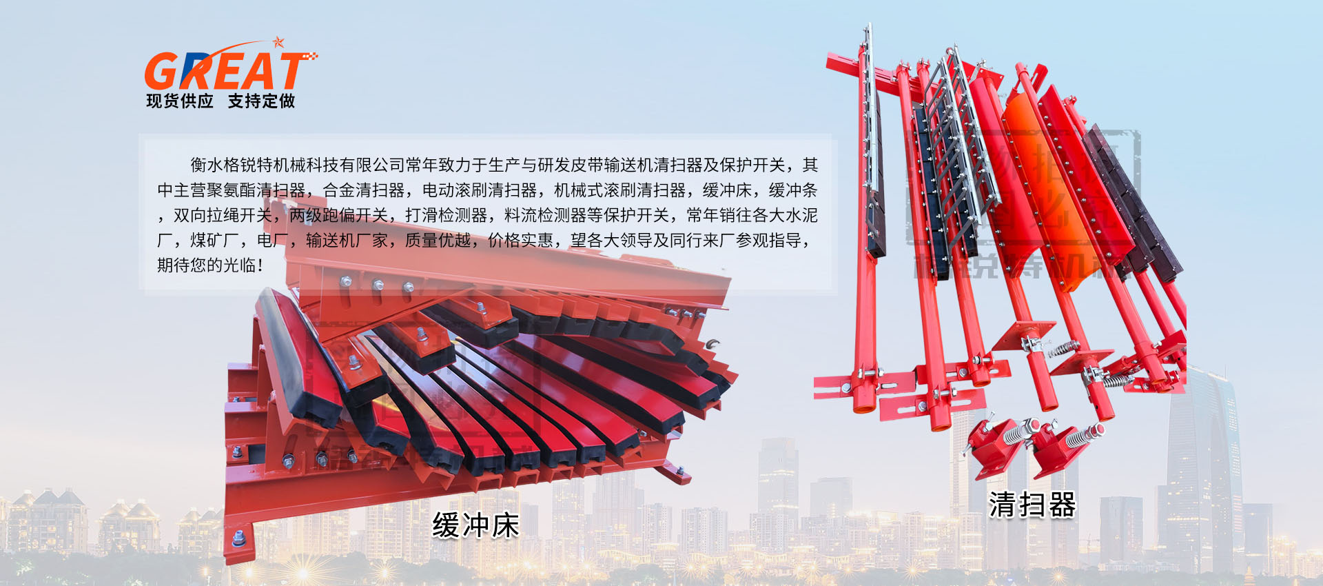 衡水格銳特機械科技有限公司常年致力于生產與研發皮帶輸送機清掃器及保護開關,其中主營聚氨酯清掃器,合金清掃器,電動滾刷清掃器,機械式滾刷清掃器,緩沖床,緩沖條,雙向拉繩開關,兩級跑偏開關,打滑檢測器,料流檢測器等保護開關,常年銷往各大水泥廠,煤礦廠,電廠,輸送機廠家,質量優越,價格實惠,望各大領導及同行來廠參觀指導,期待您的光臨!?。?/p>